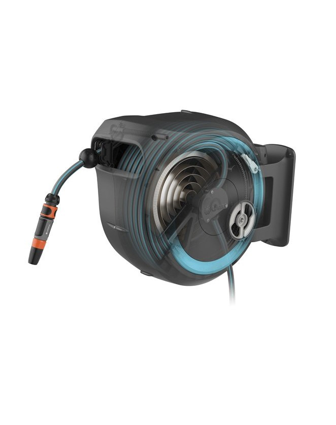 Inget böjande, inget vevande och inga smutsiga händer - det är vad trädgårdsmästare uppskattar med GARDENA väggslangboxar. Tack vare den integrerade slangledaren är slangen alltid jämnt upprullad och snabbt redo att användas när som helst. Väggslangboxen RollUp L kan svängas 180°. Slangen kan dras ut till önskad längd med hjälp av de korta låsstoppen. Tack vare RollControl räcker det med ett snabbt drag i slangen efter användning för att den ska rullas upp igen automatiskt och säkert i jämn hastighet. Ett annat plus: väggfästet kan användas för att förvara sprutor, duschar och tvättborstar inom räckhåll. Den väggmonterade slangboxen RollUp L är frostsäker och kan stå ute året runt.