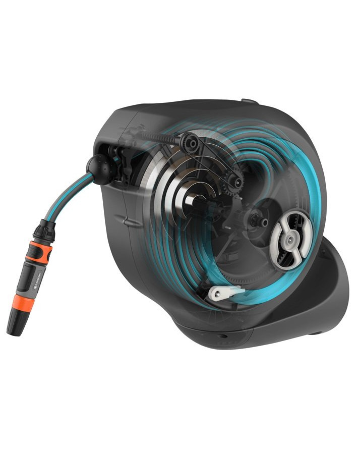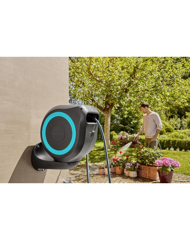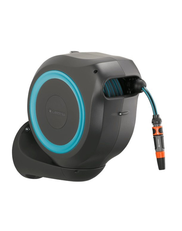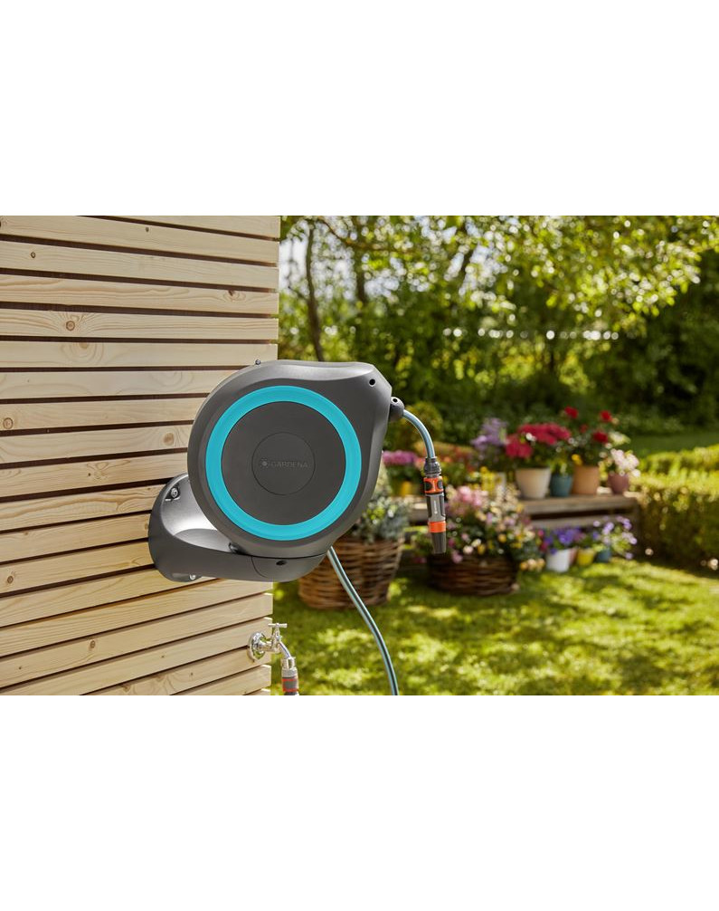 Med den väggmonterade slangboxen RollUp S blir bevattningen av trädgården bekvämare och enklare än någonsin, samtidigt som man undviker att snubbla på grund av en liggande slang. Den praktiska slangförvaringsenheten monteras helt enkelt på husväggen och ansluts till kranen med en flexibel anslutningsslang. Tack vare väggfästet kan slangboxen svängas mer än 180° så att du enkelt kan nå varje hörn av din trädgård. För direkt användning är det bara att förlänga trädgårdsslangen till en maximal längd på 15 meter. Slangen har särskilt korta stopp för att du enkelt ska kunna vattna dina växter: Så snart du stannar upp kopplas trädgårdsslangen in helt automatiskt med särskilt korta intervall! Ett lätt drag i slangens ände frigör låset och en integrerad stålfjäder med innovativ RollControl-teknik säkerställer en jämn och kontrollerad tillbakadragning. RollControl skyddar slangboxen och dess omgivning från skador som orsakas av för snabb indragning. Boxen har en integrerad slangledare som förhindrar att vattenslangen knyter sig eller gör knutar. Tack vare slang- och krananslutningarna från Original GARDENA System kan du enkelt och smidigt ansluta en förlängning eller ett annat kompatibelt GARDENA-element till slangen. Du har också alltid dina GARDENA-slangtillbehör till hands: de kan fästas under väggfästet och förvaras där för att spara utrymme. GARDENA väggslangbox är både UV- och frostsäker och kan utan problem sitta kvar på husväggen året runt. Det högkvalitativa materialet ger dig lång livslängd och användning utan underhåll. Tack vare det säkra stöldskyddet kan boxen dessutom inte stjälas och kan bara tas bort från väggen av dig. Tillsammans med väggslangboxen får du väggfästet, en anslutningsslang, alla nödvändiga originaldelar till GARDENA-systemet och monteringsdelar samt en spruta med två olika sprutstrålealternativ. Den högkvalitativa produkten levereras med 5 års garanti från GARDENA. Vattenmarsch! När du vill - med GARDENA väggmonterad slangbox RollUp S.
