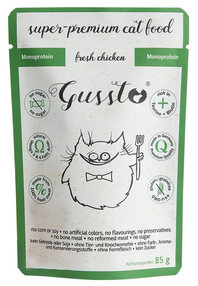 Helt komplett och suveränt balanserad kattmat i super premium. Tillverkat av 100% kött av högsta kvalitet i enlighet med de högsta standarderna för livsmedel. Gussto är kvintessensen av en bra och hälsosam kost. Innehåller mycket kött som är perfekt anpassat till katters specifika näringsbehov. Det är ett proteinfoder, därför komplett, lättsmält och mycket väl assimilerat, rekommenderas även för katter med en känslig mag-tarmkanal. Används även i eliminationsdieter vid matallergier. Ett utmärkt balanserat kalcium/fosfor-förhållande minimerar risken för urinvägs- och njursjukdomar. Dessutom innehåller Gussto foder många nödvändiga vitaminer och mineraler, är rikt på taurin och biotin, och dess komponent är fördelaktig safflorolja - rik på omättade fettsyror, som har en antiinflammatorisk effekt, reglerar matsmältningen och regenerativa funktioner i levern samt stärker immunförsvaret.