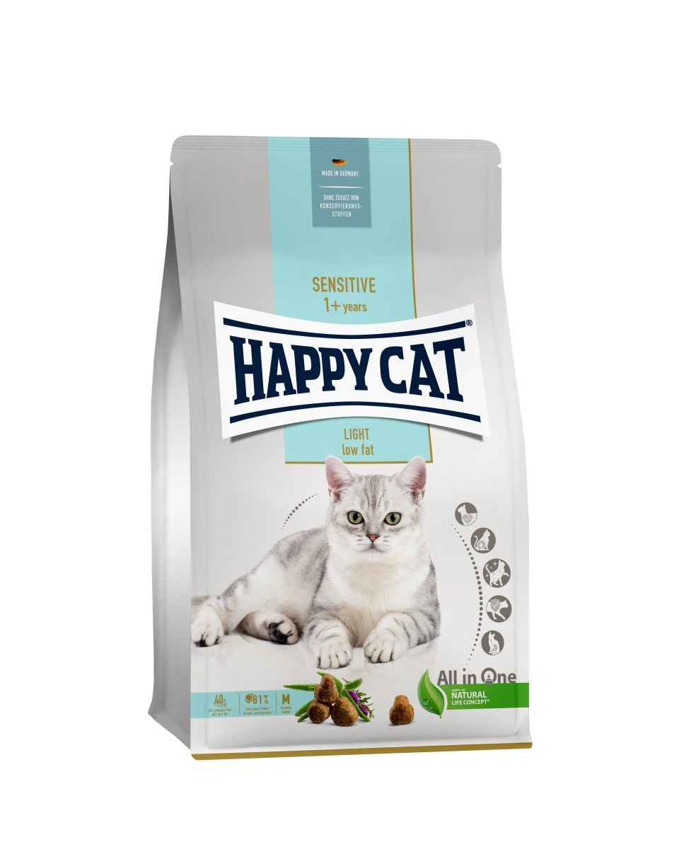 Det välsmakande Happy Cat Sensitive Light-receptet med värdefull rosmarin och mjölktistel har utvecklats för katter med tendens till övervikt och för att bibehålla deras kroppskonstitution. Det mättande, fiberrika fodret innehåller endast 9% fett. Sammansättningen av lättsmält fjäderfä och vom feinsten ger mer njutning och variation i matskålen tack vare de tre olika formerna av kibble. Baserat på Happy Cat Natural Life Concept® har våra näringsexperter tagit fram en speciell vitalitetsformel som täcker kattens fem viktigaste behov på ett Nature sätt. Det är näringsmässigt bekräftat och säkerställer regelbunden matsmältning, stärker immunförsvaret, stöder urinvägarna, främjar hjärthälsan och är bra för hud och päls.