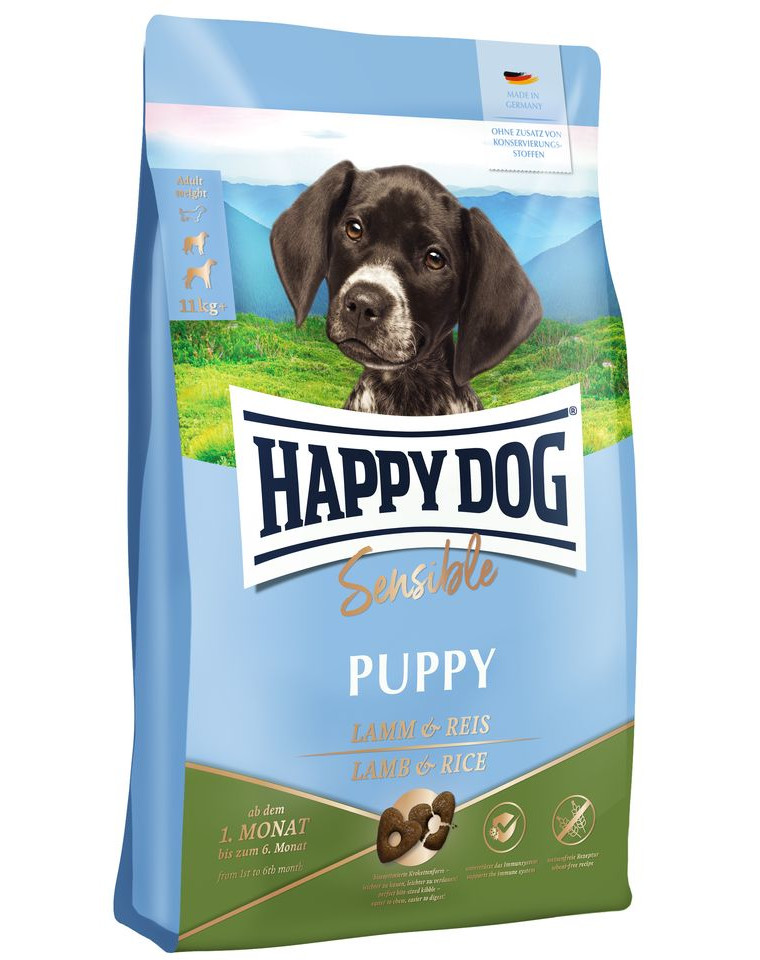 Happy Dog Sensible Puppy med väl tolererat lamm och lättsmält ris är perfekt anpassat till behoven hos valpar från 1 månads ålder. Tack vare sitt fjäderfäfria recept är Sensible Puppy också mycket lämplig för känsliga hundar. En balanserad kost med värdefulla musslor från Nya Zeeland och C-vitamin stöder en optimal utveckling. Baserat på Happy Dog Natural Life Concept® får din älskling allt som hans organism behöver för att dra nytta av helheten och han kan börja ett långt hundliv utan bekymmer. Från 7 månaders ålder bör du långsamt byta din valp till Happy Dog Sensible Junior med lamm och ris. Under unghundsfasen växer din lilla älskling långsammare och behöver därför en mindre näringsrik kost.