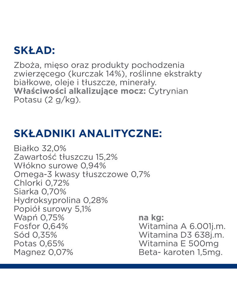 KOMPOSITION: Spannmål, kött och animaliska ingredienser (kyckling 14%), vegetabiliska proteinextrakt, oljor och fetter, mineraler. Alkaliserande medel för urinvägarna: kaliumcitrat (2 g/kg).