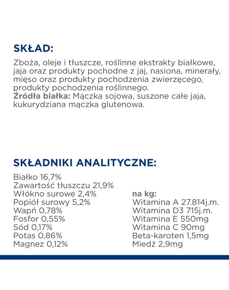 INGREDIENSER: Brewers Rice, kyckling, kycklingfett, äggprodukt, sojabönsmjöl, linfrö, cellulosapulver, kycklingleverarom, dikalciumfosfat, mjölksyra, sojabönsolja, kaliumklorid, torkad betmassa, glycerolmonostearat, kalciumkarbonat, DL-metionin, vitaminer (vitamin E-tillskott, L-askorbyl-2-polyfosfat (källa till vitamin C), niacintillskott, tiaminmononitrat, vitamin A-tillskott, kalciumpantotenat, pyridoxinhydroklorid, biotin, vitamin B12-tillskott, riboflavintillskott, folsyra, vitamin D3-tillskott, menadion-natriumbisulfitkomplex (källa till vitamin K)), fiskolja, kolinklorid, joderat salt, L-lysin, L-arginin, taurin, mineraler (zinkoxid, manganoxid, kalciumjodat, natriumselenit), L-tryptofan, L-karnitin, blandade tokoferoler för friskhet, Nature aromämnen, betakaroten.