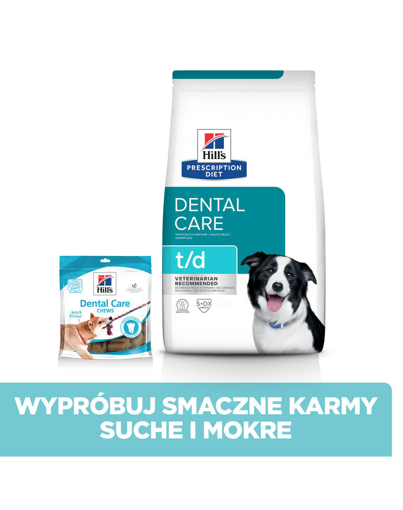 Hill's Prescription Diet t/d hundfoder med kyckling är ett helfoder för vuxna hundar med kliniskt beprövad tandteknik.