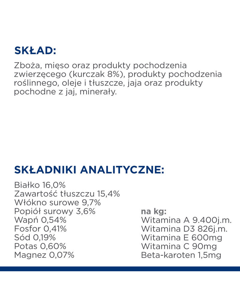 SAMMANSÄTTNING: Spannmål, kött och animaliska ingredienser (kyckling 8%), vegetabiliska ingredienser, oljor och fetter, ägg och äggprodukter, mineraler.