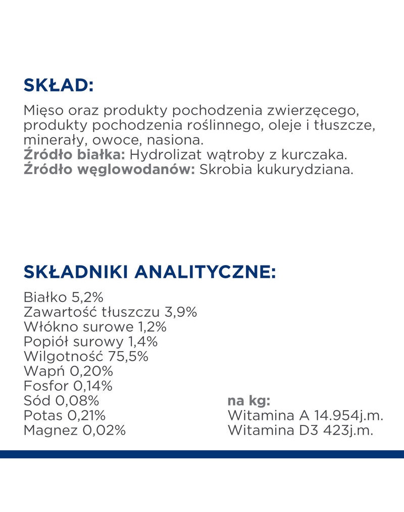 SAMMANSÄTTNING: Kött och animaliska ingredienser, vegetabiliska ingredienser, mineraler, oljor och fetter, frukt, frön. Proteinkälla: Hydrolysat av kycklinglever. Kolhydratkälla: majsstärkelse.