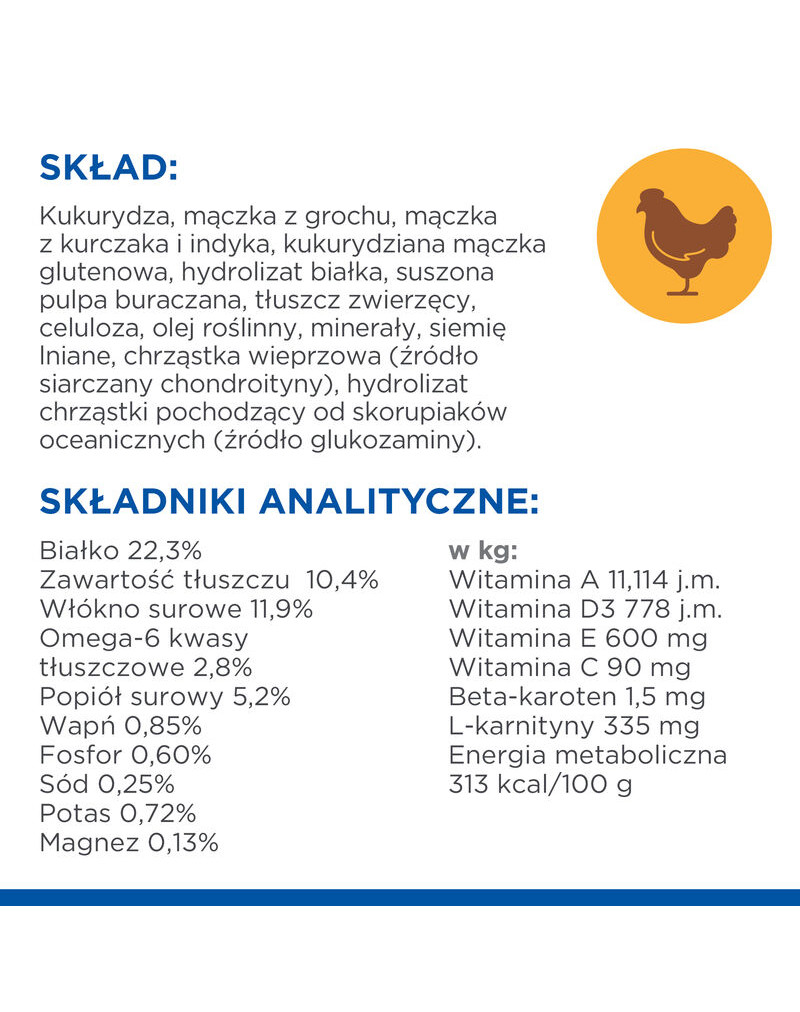 KOMPOSITION: Kycklingmjöl, korn, ärtfiber, hela vetekorn, hela majskorn, majsglutenmjöl, hela sorghumkorn, cellulosapulver, kycklingleverarom, sojaolja, torkad betmassa, linfrö, mjölksyra, fläskarom, kaliumklorid, L-lysin, joderat salt, kolinklorid, kalciumkarbonat, vitaminer (E-vitamintillskott, L-askorbyl-2-polyfosfat (källa till C-vitamin), niacintillskott, tiaminmononitrat), kalciumjodat, natriumselenit), taurin, havrefibrer, blandade tokoferoler för att bibehålla färskhet, L-karnitin, naturliga smaker, betakaroten, äpplen, broccoli, morötter, tranbär, gröna ärtor.