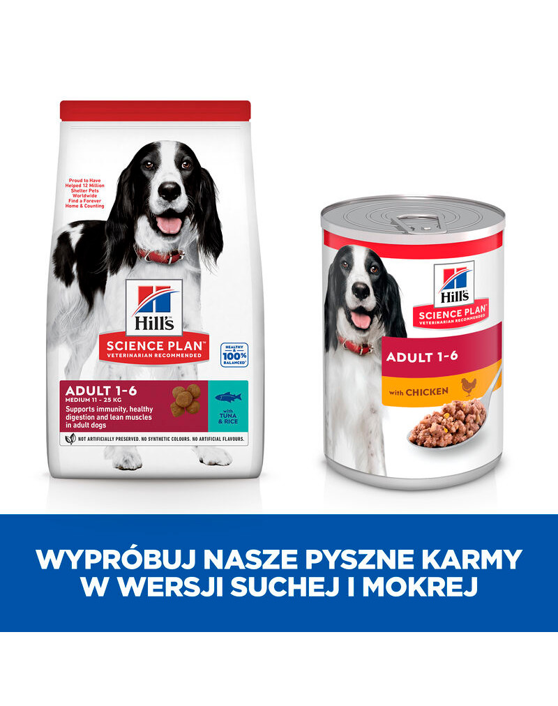 Hill's Science Plan Canine Adult Medium Tuna and Rice med kliniskt bevisade antioxidanter, högkvalitativa proteiner och omega-3-fettsyror stöder utvecklingen av mager muskelmassa och hälsan hos vitala organ.
