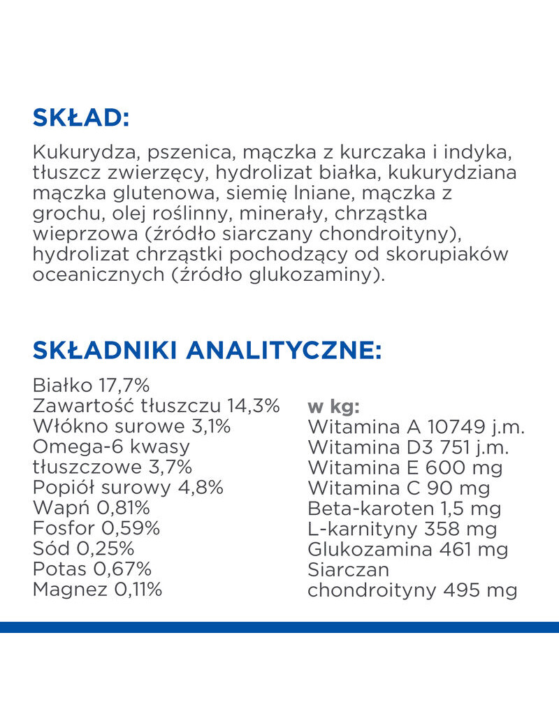 Ingredienser: Majs, vete, kyckling- och kalkonmjöl, animaliska fetter, proteinhydrolysat, majsglutenmjöl, linfrö, ärtmjöl, vegetabilisk olja, mineraler, brosk från gris (källa till kondroitinsulfat), broskhydrolysat från marina kräftdjur (källa till glukosamin).
