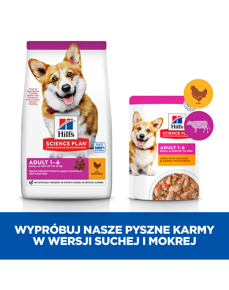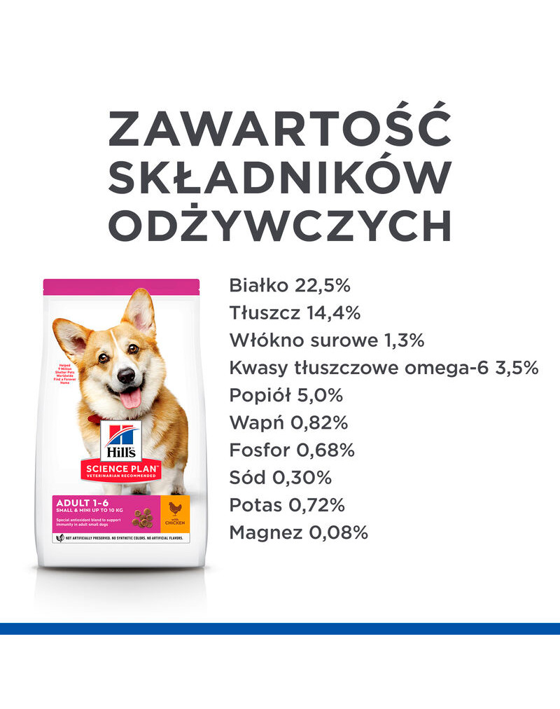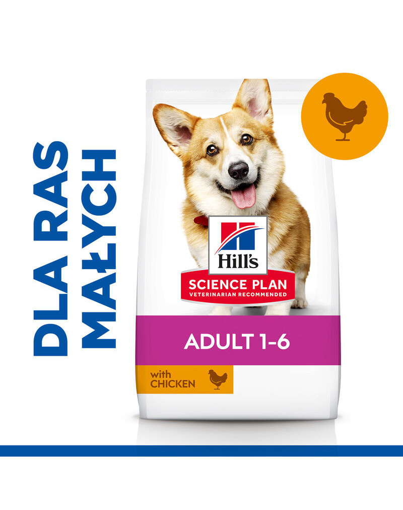 Torrfoder för hundar av små raser, smak av kyckling, speciellt framtaget för små munnar. Lättsmält näring med högkvalitativt protein för att bibehålla magra muskler samt omega-6-fettsyror och vitamin E för en frisk päls. Även om din hund är liten är den fortfarande en fullvuxen hund. Med HILL'S Science Plan Small & Mini Adult hundfoder med lamm och ris kan du se till att din hund av små raser får en perfekt balanserad kost. Hundfodret är tillverkat av lättsmälta ingredienser som är speciellt anpassade till de små magarna hos hundar av små raser. De små pelletsen är perfekta för små munnar och högkvalitativt protein hjälper till att bibehålla magra muskler. Dessutom främjar närande omega-6-fettsyror och vitamin E frisk hud och päls. För att stödja immunförsvaret hos din lilla pälsboll innehåller detta hundfoder en speciell antioxidantförening för ett långt och hälsosamt liv för din vuxna hund av liten ras. Med det nya utseendet kommer Science Plan nu att göra dig ännu mer entusiastisk. Vissa av våra produkter har nu också fått ett nytt namn, nya pelletsformer och nya sammansättningar.