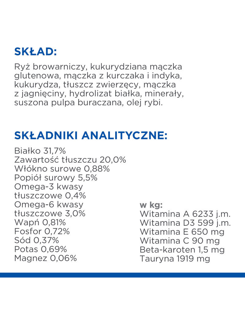 Fodermedlets sammansättning innehåller högkvalitativa, lättsmälta ingredienser. Taurin stöder en hälsosam hjärtfunktion och det balanserade mineralinnehållet stöder njur- och urinblåsans funktion. Det högkvalitativa proteinet i fodret stöder muskelfunktionen. Vitamin E och omega-3- och omega-6-fettsyror bidrar till att bibehålla en frisk och vacker hud och päls.