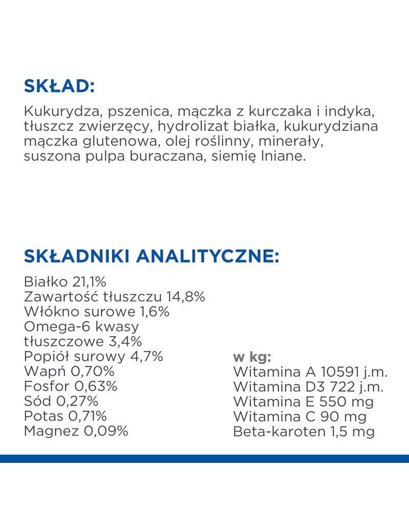 - Hjälper, hjälper till att upprätthålla vacker hud och en frisk päls med ett exakt balanserat innehåll av omega-6-fettsyror och vitamin E