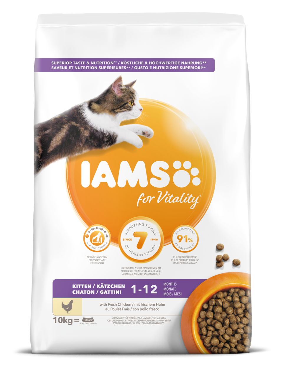 IAMS for Vitality för kattungar med färsk kyckling är ett 100% komplett och balanserat foder. Det nya, välsmakande och förbättrade receptet innehåller upp till 91% animaliskt protein (av det totala proteininnehållet) och alla ingredienser som behövs för en kattunge som växer och utvecklas. Det utsökta fodret innehåller inga onödiga tillsatser, inga konstgjorda färg- eller smakämnen och inga GMO. Dessutom är det nya receptet vetefritt*.