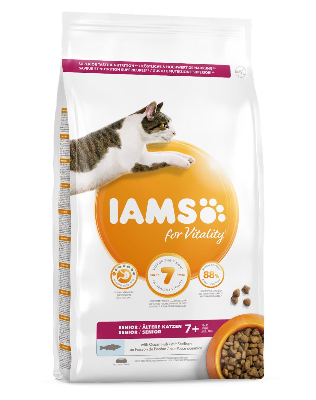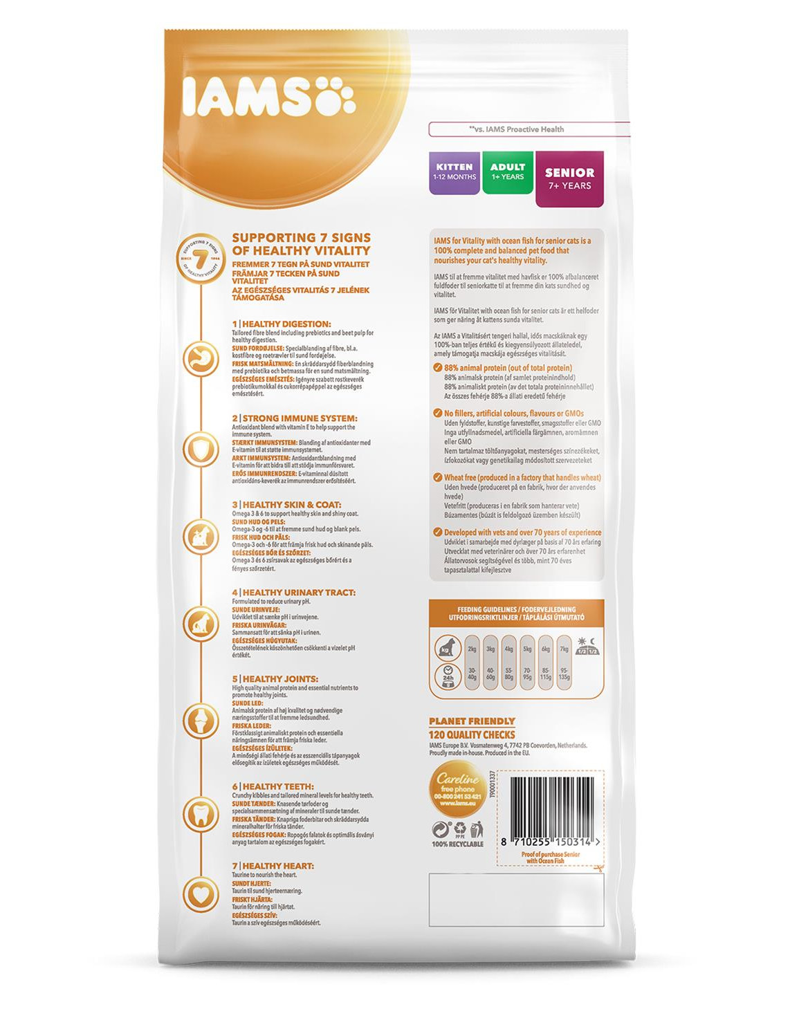 IAMS for Vitality Senior med havsfisk är ett 100 % komplett och perfekt balanserat foder för äldre katter som uppfyller de 7 kriterierna för att främja din katts hälsosamma vitalitet, såsom en slående vacker, glänsande päls och frisk hud. Det extremt välsmakande receptet med 88% animaliskt protein (som en procentandel av det totala proteininnehållet) kommer att uppskattas av din fyrbenta vän varje dag.