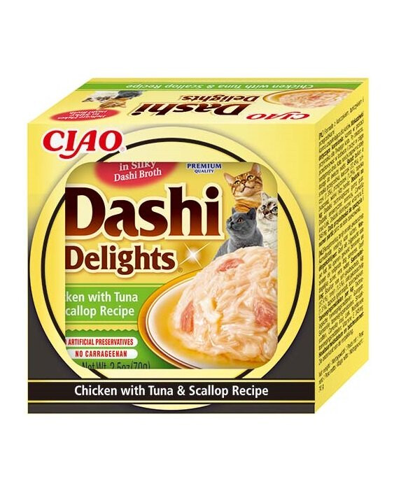 .Dashi är en traditionell japansk fiskbuljong baserad på flingor av skipjack tonfisk, känd för sin rika, unika smak. Det är en unik godbit med hög fukthalt, rik på animaliskt protein och fri från spannmål, oönskade tillsatser och konstgjorda ingredienser. INABA Dashi Delights godis gör varje måltid speciell. Återfuktande, näringsrika och läckra! Upp till 8 smaker att välja mellan.