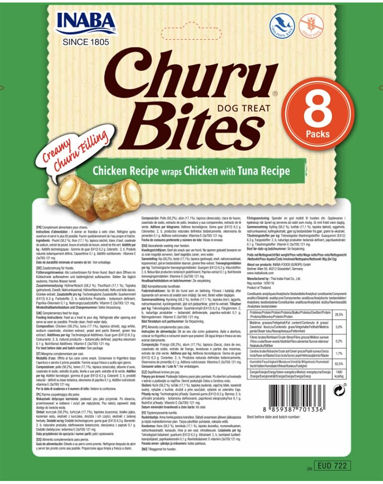 Unika krämiga Churu Bites-godisbitar för hundar direkt från Japan. Churu är kalorifattigt, fritt från spannmål och konserveringsmedel och tillverkat av kött från frigående kycklingar som föds upp på strikt kontrollerade gårdar och djuphavstonfisk som fångas på ett hållbart sätt och är certifierat delfinsäkert.