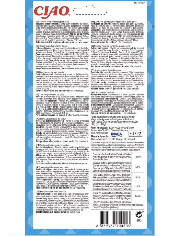 Ingredienser: Kyckling (41,6%), tonfisk (32,9%), tapioka (torkad), äggproteinpulver, natriumkaseinat, kammussla (0,9%), kammusselextrakt, kycklingextrakt, jästextrakt, grönt te-extrakt.