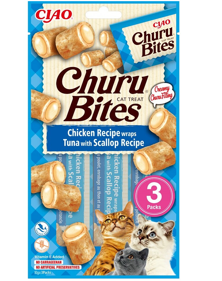 Unika krämiga Churu Bites-godisbitar för katter direkt från Japan. Churu är kalorifattiga, spannmåls- och konserveringsmedelsfria och tillverkas med kött från frigående kycklingar som föds upp Nature på strikt kontrollerade gårdar och djuphavstonfisk som fångats på ett hållbart och certifierat delfinsäkert sätt. Förpackningen är speciellt utformad så att du kan mata din katt från din hand, vilket gör ert band ännu starkare.