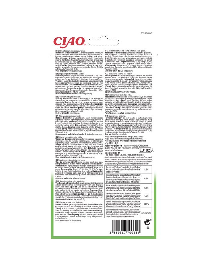 Tonfisk (15,0%), kyckling (15,0%), tapioka, tonfiskextrakt, kollagen, grönt te-extrakt