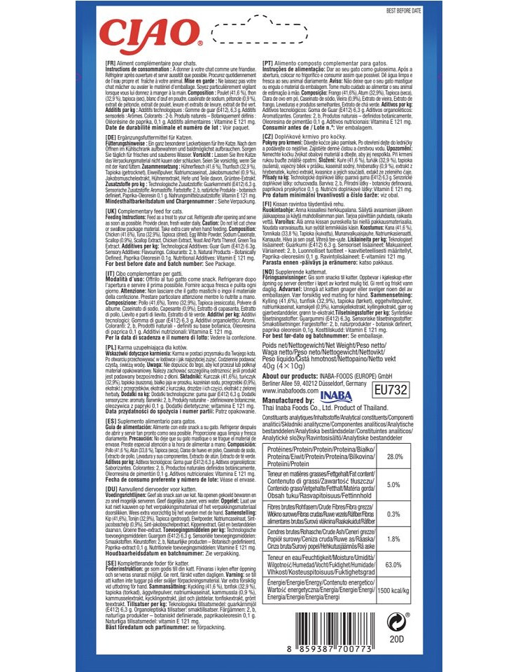 Ingredienser: Kyckling (41,6%), tonfisk (32,9%), tapioka (torkad), proteinpulver, natriumkaseinat, kammussla (0,9%), kammusselextrakt, kycklingextrakt, jästextrakt, grönt te-extrakt.