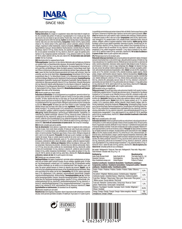 Ingredienser: kyckling (32,8%), tapioka (torkad), ost (2,1%), kycklingextrakt (1,6%), jästextrakt, kalciumkarbonat, kaliumklorid, kollagen, magnesiumsulfat heptahydrat, dicalciumfosfat. Tillsatser per 1 kg: Teknologiska tillsatser: guargummi. Sensoriska tillsatser: oleoresin av paprika, Camellia thea Link. Dietetiska tillsatser: vitamin E 574 mg, kolinklorid, zinksulfat monohydrat 26,0 mg, vitamin B2, järnsulfat monohydrat (II) 10,4 mg, vitamin A, vitamin B1, kopparsulfat pentahydrat (II) 2,0 mg, mangan(II)sulfat monohydrat 1,3 mg, kaliumjodid 0,5 mg, vitamin D3 182 IU, natriumselenit 0,04 mg, folsyra, vitamin B12.