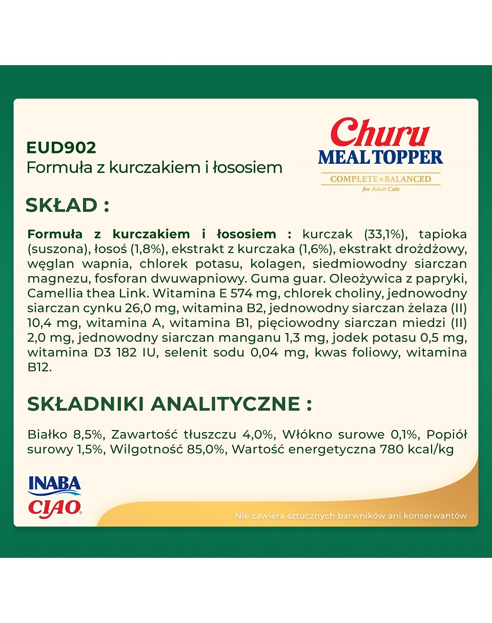 Precis som andra produkter från Inaba, tillverkas Meat Topper enbart av högkvalitativa ingredienser, inklusive: djuphavstunfisk och frigående kyckling. Fodren är lågt kaloriinnehållande, spannmålsfria och har en hög fuktighetsnivå.