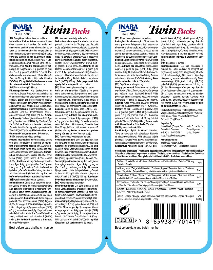 Ingredienser: kycklingbuljong, kyckling (42,6%), morotsflingor (2,6%), gröna ärtor (2,6%), ost (2,2%). Tillsatser per 1 kg: Teknologiska tillsatser: agar 4,9 g, guargummi (E412) 4,8 g, xantangummi 1,2 g, 2b naturliga produkter definierade botaniskt, Camellia thea Link 30 mg. Sensoriska tillsatser: aromer. Diettillsatser: vitamin E (3a700) 485 mg.