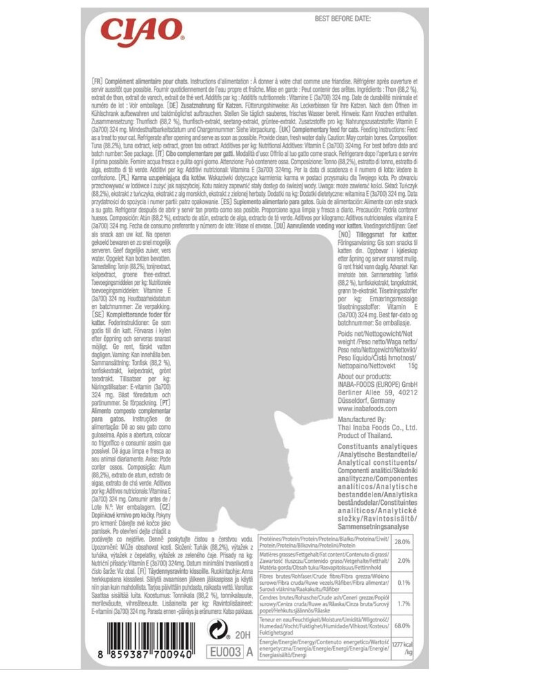 Ingredienser: Tonfisk (88,2%), tonfiskextrakt, algextrakt, grönt te-extrakt