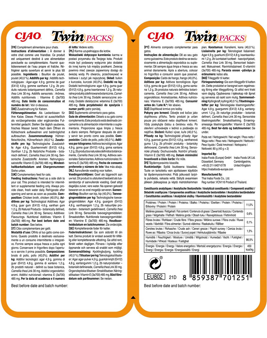 Ingredienser: kycklingbuljong, kyckling (40,0%). Tillsatser per 1 kg: Teknologiska tillsatser: agar 4,9 g, guargummi (E412) 4,8 g, xantangummi 1,2 g, 2b naturliga produkter definierade botaniskt, Camellia thea Link 30 mg. Sensoriska tillsatser: aromer. Dietetiska tillsatser: vitamin E (3a700) 485 mg.