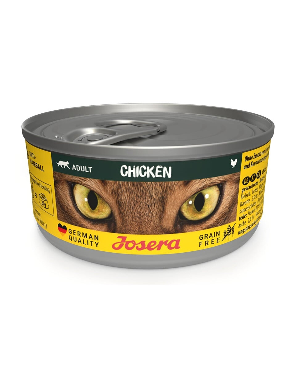 Mmm, dags för en läcker variation! Vårt nya sortiment av blötfoder på burk för katter erbjuder ännu fler val och ännu fler smaker i skålen. Din fyrbenta vän kommer att bli förtjust i den läckra rätten Josera Chicken med delikat kyckling. Den spannmålsfria formulan är berikad med laxolja, som tillhandahåller nödvändiga omega-3-fettsyror och förstärker smakprofilen.