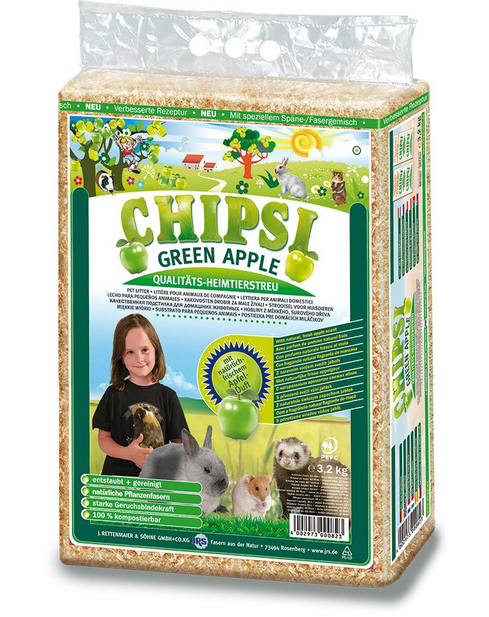 Chipsi Apple är ett naturligt, dammfritt strömedel för smådjur som innehåller en fräsch, naturlig äppeldoft.