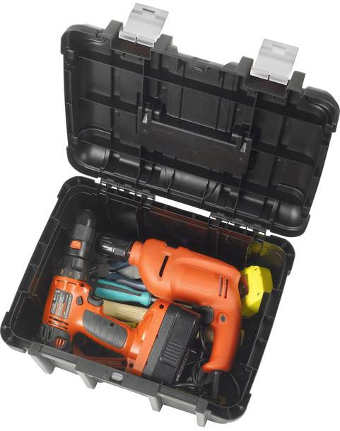 Lådan har ett säkert låssystem med solida metallås för att skydda innehållet under transport. Ett brett handtag med räfflad handsektion gör den lätt att bära.