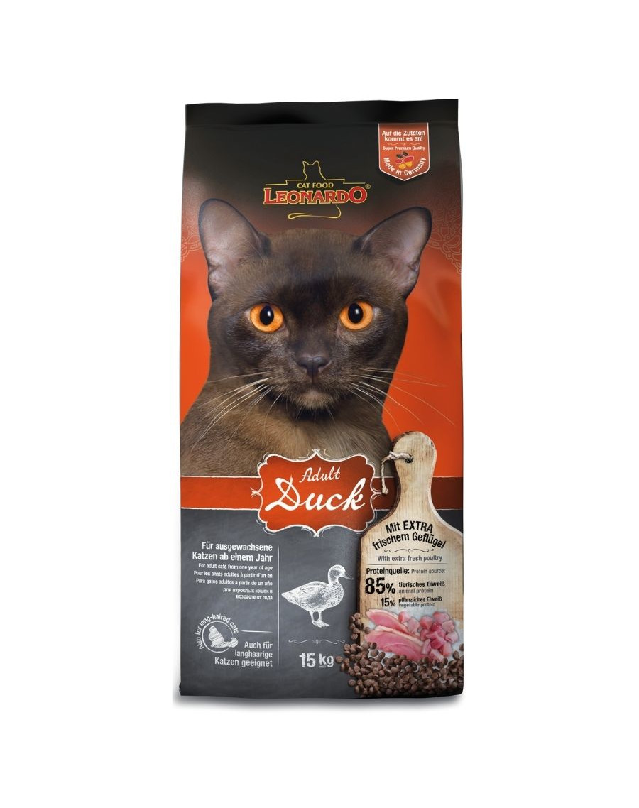 Leonardo® Adult Duck är en utsökt smakvariant för katter som älskar fjäderfä. Receptet har också förfinats med chiafrön och utsökt krill - kräftdjur från Antarktis. Deras höga innehåll av omega-3-fettsyror, tillsammans med lecitin, säkerställer en frisk hud och en glänsande päls.