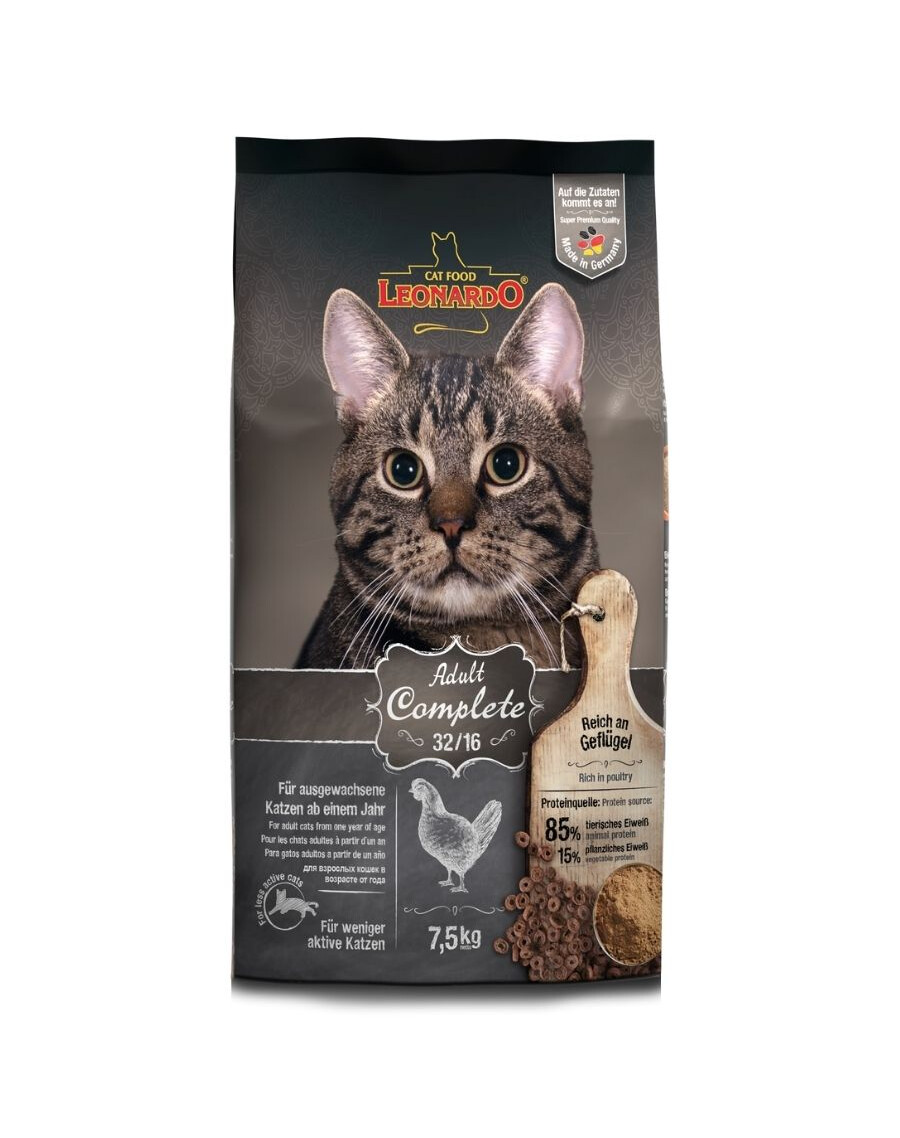 LEONARDO Adult Complete 32/16, den läckra smakvarianten från LEONARDO® Adult-sortimentet med ett måttligt energiinnehåll (16 % fett) för katter som är mindre aktiva.