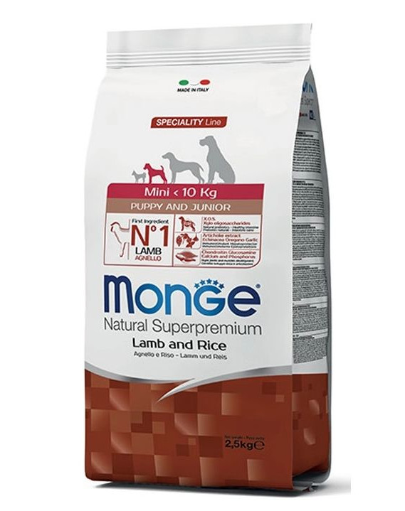 Monge Natural Superpremium Speciality Line Mini Puppy Lamb with Rice är ett helfoder rikt på lamm för valpar av små raser. Det garanterar din hunds välbefinnande tack vare den mycket höga kvaliteten på näringsämnena, som är perfekt balanserade i ett italienskt originalrecept. Huvudingrediensen är lamm berikat med XOS (xyloligosackarider), en naturlig prebiotika som stöder tarmfunktionen.