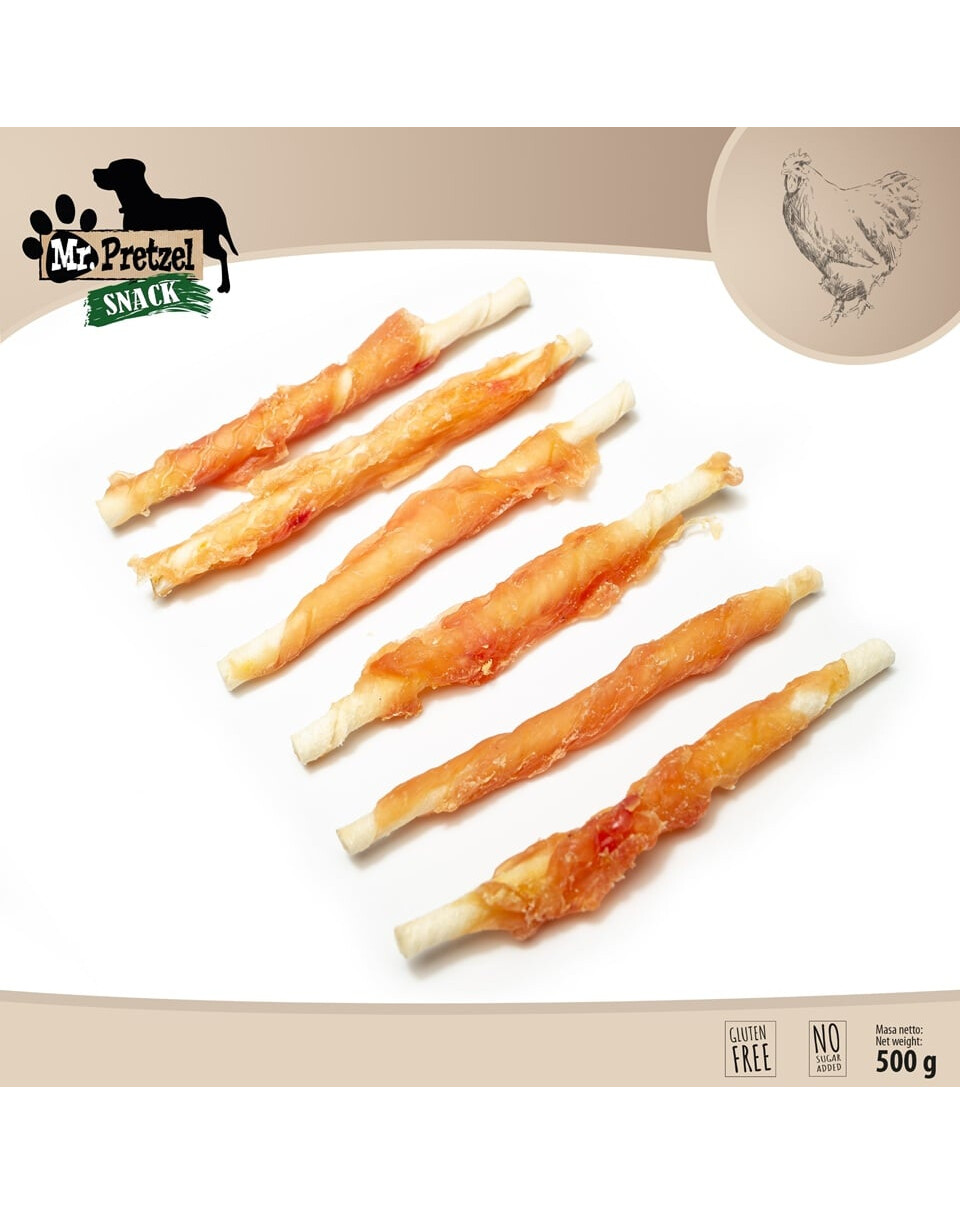 Den naturliga pinnen lindad med kyckling från Mr. Pretzel är ett utmärkt val för hundar som älskar att tugga och bita.