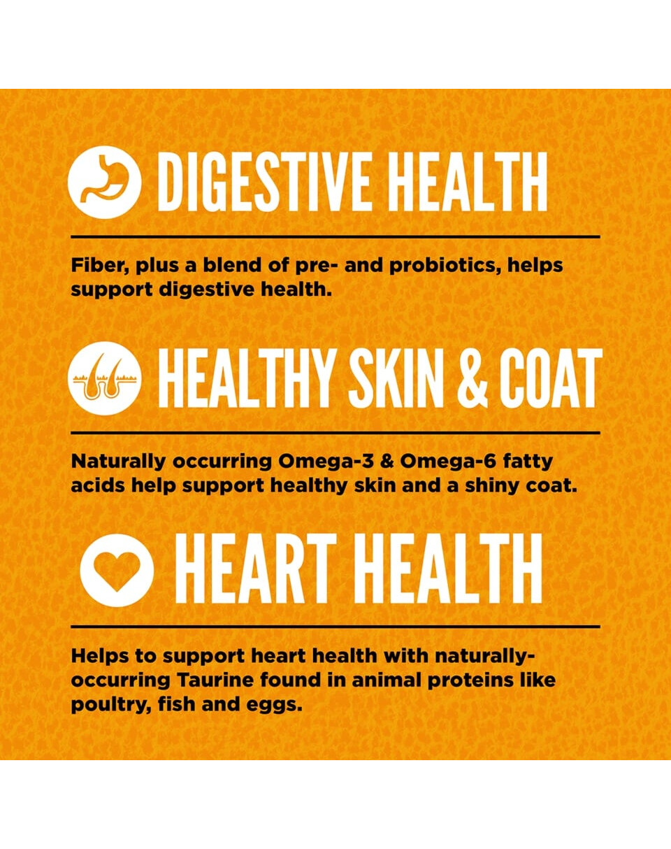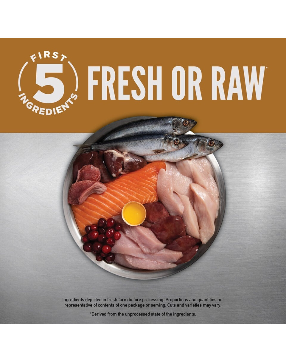 Färskt kycklingkött (18%), färskt kalkonkött (7%), färska hela ägg (5%), färsk kycklinglever (5%), färska hela ben (4%), färska hela månar (4%), färsk kalkonlever (4%), färska kycklinghjärtan (4%), färska kalkonhjärtan (4%), färska kycklinghalsar (4%), Kyckling (torkad, 4%), kalkon (torkad, 4%), hel makrill (torkad, 4%), hela sardiner (torkade, 4%), hel sill (torkad, 4%), kycklingfett (3%), hela röda linser, hela gröna ärtor, hela gröna linser, hela kikärter, hela gula ärtor, linsfiber, hela pintobönor, hela vita bönor, kycklingbrosk (torkat, 1%), sillolja (1%), kycklinglever (frystorkad), kalkonlever (frystorkad), färsk pumpa, färska hela zucchini, färska hela palsternackor, färska hela rotfrukter, färska hela röda äpplen, färska päron, färsk grönkål, färsk spenat, färsk mangold, färska morotsblad, brun tång, hela tranbär, hela blåbär, hel saskatoon, cikoria morot, gurkmeja, mjölktistel, kardborre morot, lavendel, hemorrojderot, nypon, enterokockkalcium.