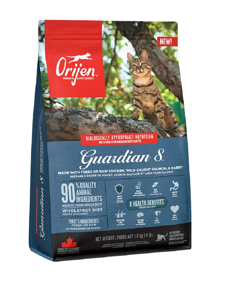 ORIJEN Guardian 8 innehåller upp till 90 %* animaliska ingredienser av högsta kvalitet, varav upp till 2/3 är färska eller råa. Alla dessa ingredienser stödjer din katts allmänna hälsa och ger 8 fördelar för din katts hälsa
