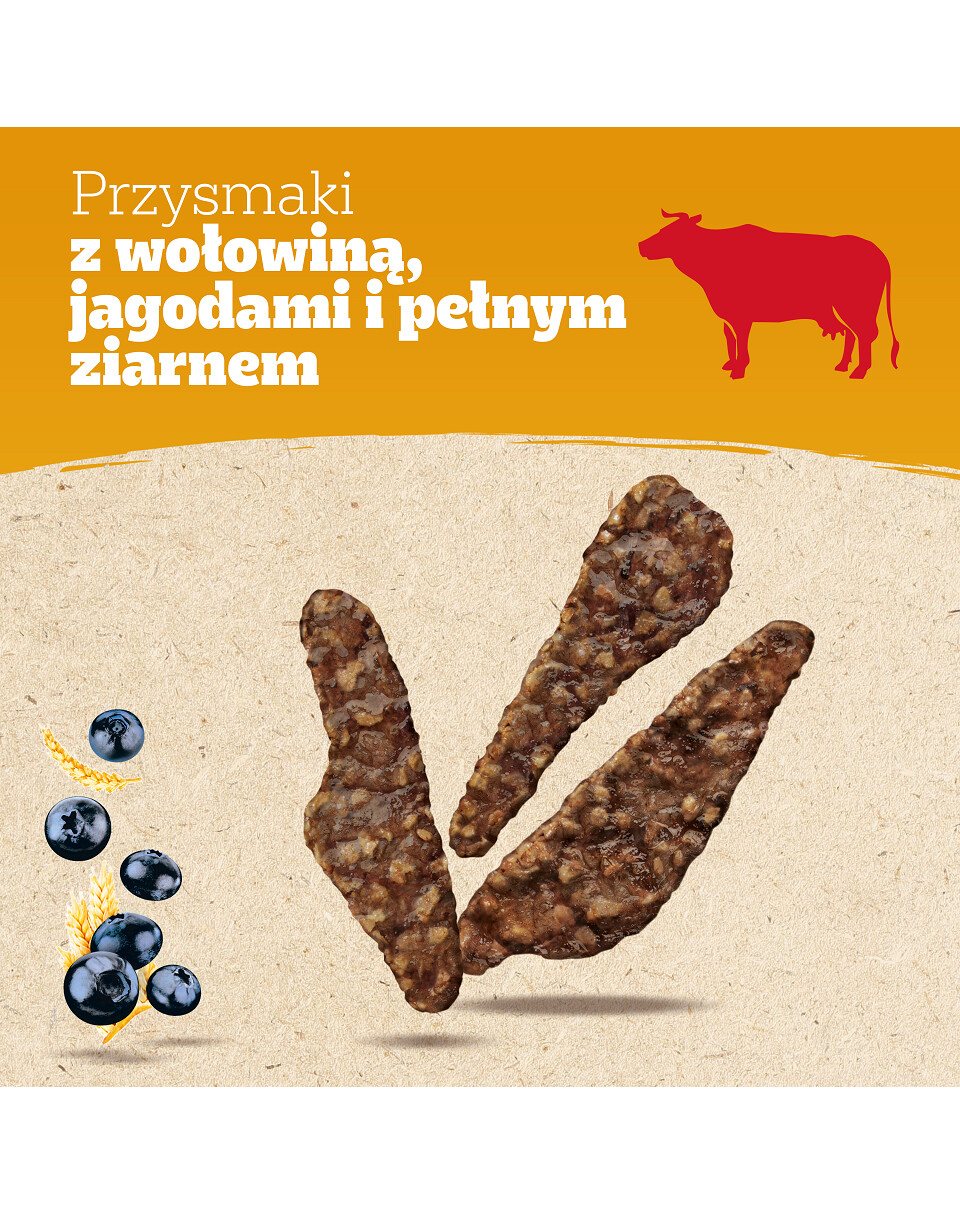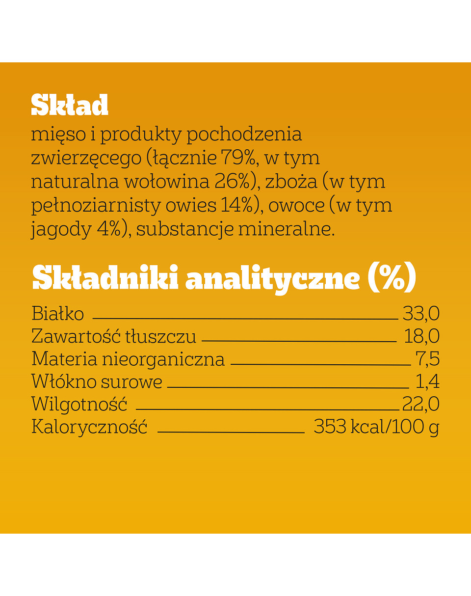 Ingredienser: kött och animaliska biprodukter (totalt 79%, varav naturligt nötkött 26%), spannmål (inklusive fullkornshavre 14%), frukter (inklusive bär 4%), mineralämnen.
