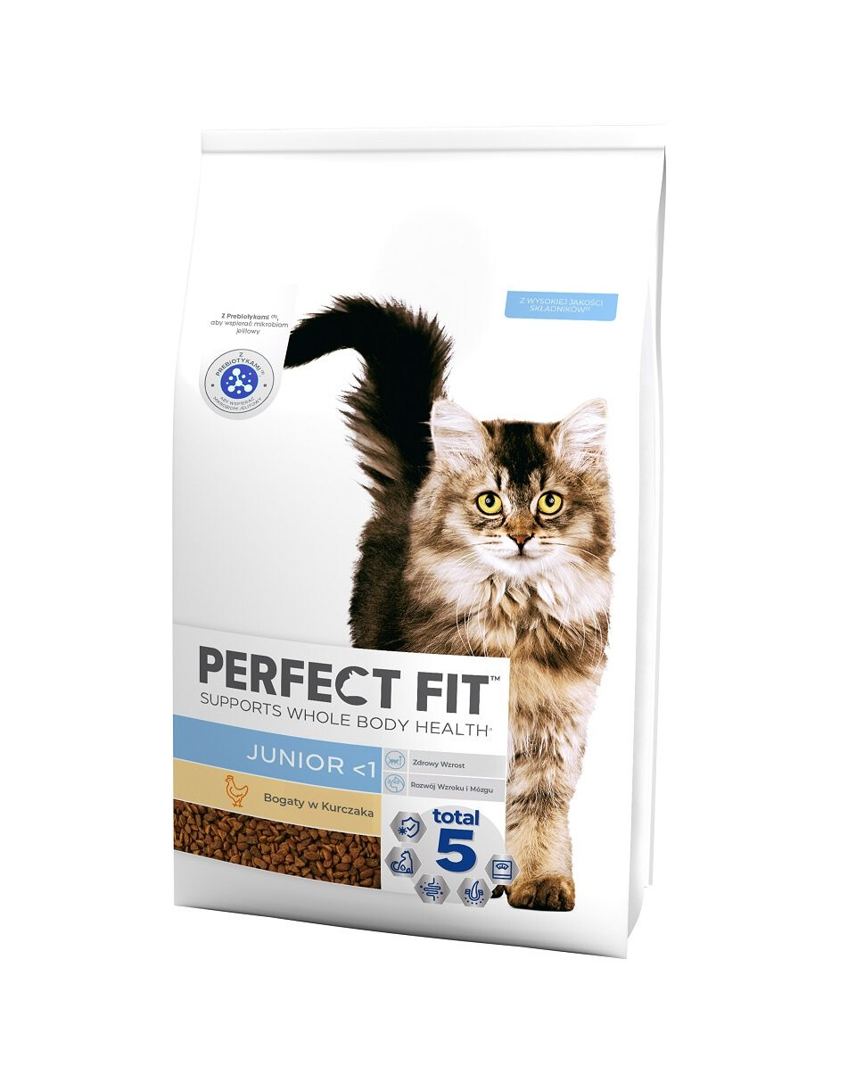 Den läckra Perfect Fit Junior <1 med kyckling innehåller den unika Total 5-formeln, som stöder de 5 viktigaste områdena för ett växande husdjurs hälsa: ett starkt immunförsvar, hälsosam matsmältning, hälsosamma urinvägar, hälsosam hud och päls, samt upprätthållande av optimal kroppsvikt och vikt. Receptet Perfect Fit Junior <1 har utvecklats i samarbete med veterinärer och nutritionister från WALTHAM Institute of Animal Science för att förse växande katter med viktiga näringsämnen. Precis som de andra varianterna erbjuder Perfect Fit Junior <1 med kyckling också ytterligare fördelar: Det stöder en sund tillväxt, syn- och hjärnutveckling, sund benutveckling och innehåller naturliga prebiotika för att vårda tarmfloran. När du väljer det här fodret kan du vara säker på att den unika Perfect Fit-formeln främjar hälsan i hela kattungens kropp och ger ytterligare hälsofördelar som är särskilt anpassade till kattungens ålder och individuella behov.