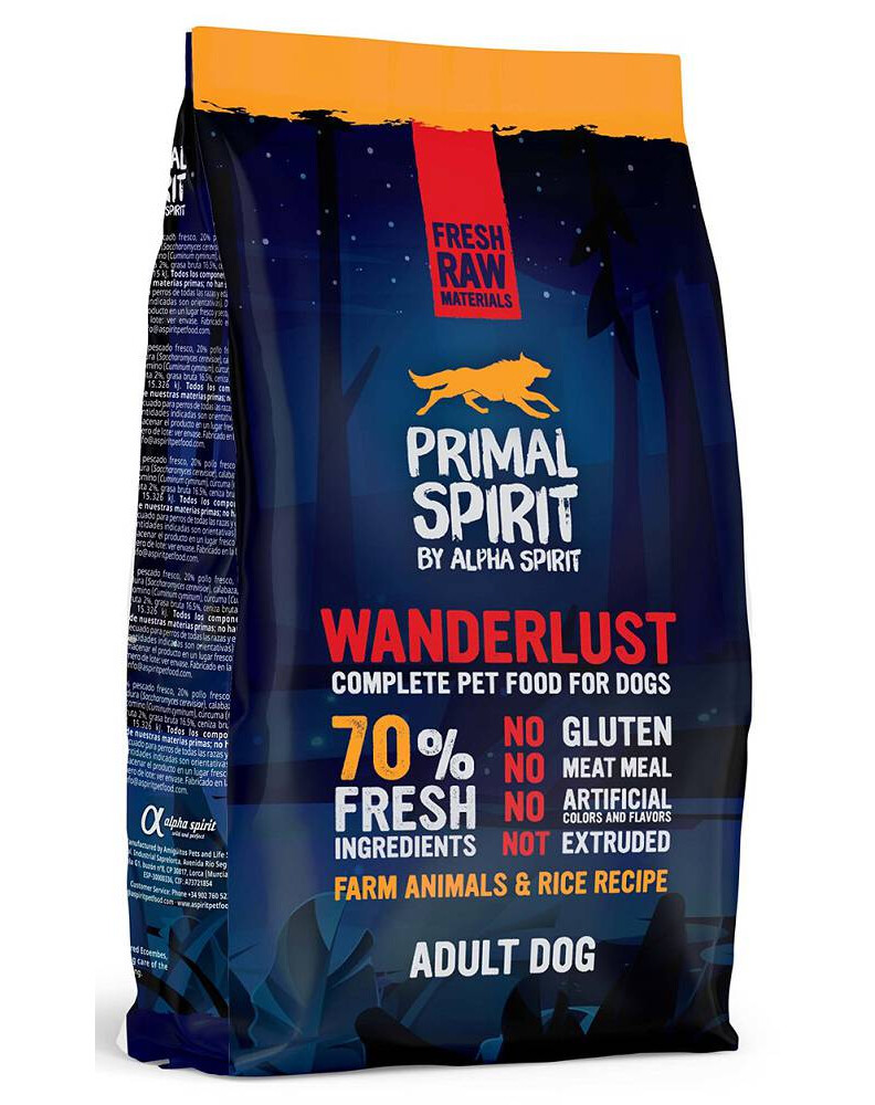 Primal Spirit Wanderlust är ett glutenfritt, halvmjukt foder för vuxna hundar med ris och kyckling.