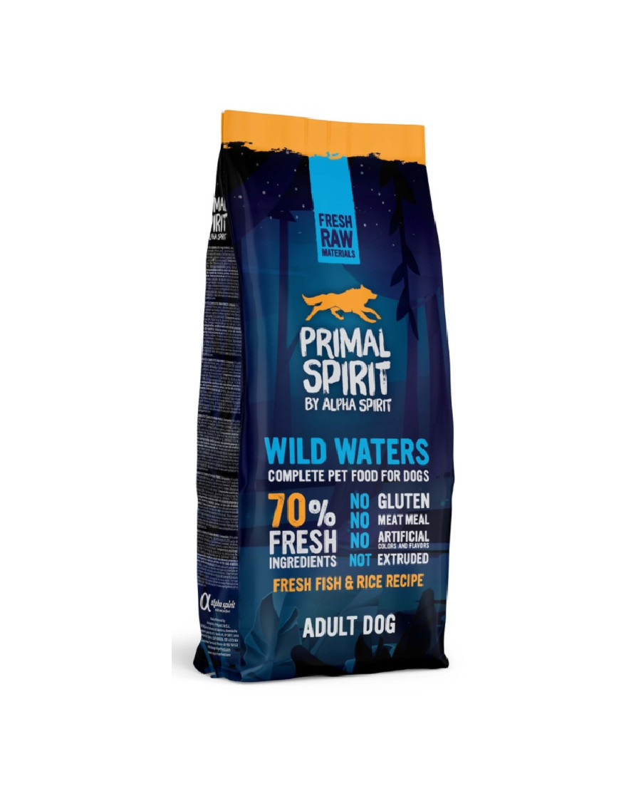 Primal Spirit Wild Waters är ett glutenfritt, halvmjukt foder för vuxna hundar med ris och fisk.