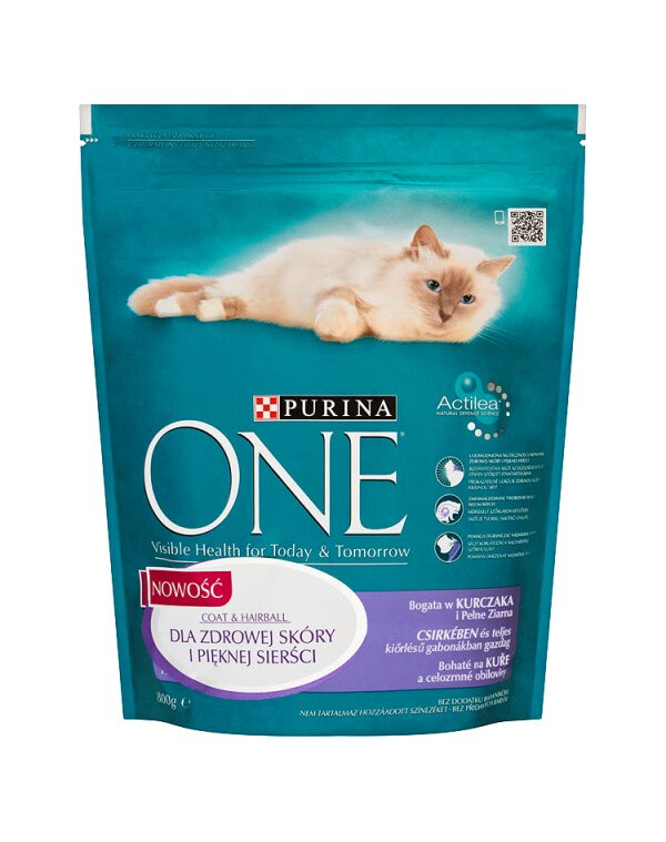 Purina ONE Coat & Hairball-formulan är utvecklad av veterinärer och nutritionister för att hjälpa till att bibehålla en frisk päls och hud. Produkten innehåller rätt nivå av viktiga näringsämnen, bland annat högkvalitativt protein, vitamin E och fettsyror, med bevisad effekt för att bibehålla hudens hälsa. Hög fiberhalt hjälper till att minimera bildningen av hårbollar.