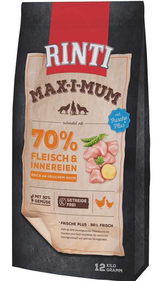 .Rinti Max-i-Mum är tillagat med 65% färskt kött och färska slaktbiprodukter. Detta motsvarar mer än 90 % av det använda köttet. Detta främjar köttets Nature-smak och bidrar till att maten utnyttjas på bästa sätt. Den ökade fetthalten säkerställer ett balanserat förhållande mellan protein och fett för en skonsam matsmältning. Hundar är köttätare av nature. Därför använder Rinti Max-i-Mum en hög andel färskt kött, som bearbetas i en komplex produktionsprocess, och inget spannmål.