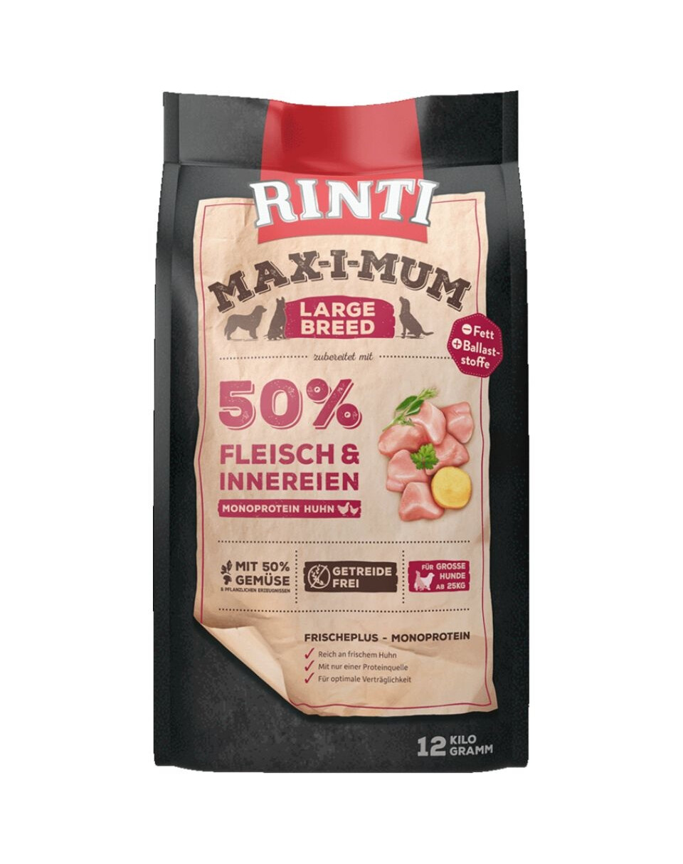 Rinti Maximum Large Breed är ett foder som är speciellt utvecklat för stora hundar som väger minst 25 kg. Innehåller 50 % kött och inälvor och endast kycklingmonoprotein för stora hundars känsliga magar. Mer fibrer för optimal viktkontroll och L-karnitin för att stödja fettmetabolismen. Glukosamin (ingår i extrakt från grönläppad mussla) bidrar till att bibehålla ett friskt brosk och friska leder. Nature spannmålsfritt, utan majs, gluten, soja, smakförstärkare eller konstgjorda tillsatser. Större portioner mat kan bidra till att minska hetsätning. Eftersom hundar är köttätare av nature innehåller Rinti Max-i-Mum stora mängder färskt kött, som bearbetas i en komplex produktionsprocess, och är spannmålsfritt.