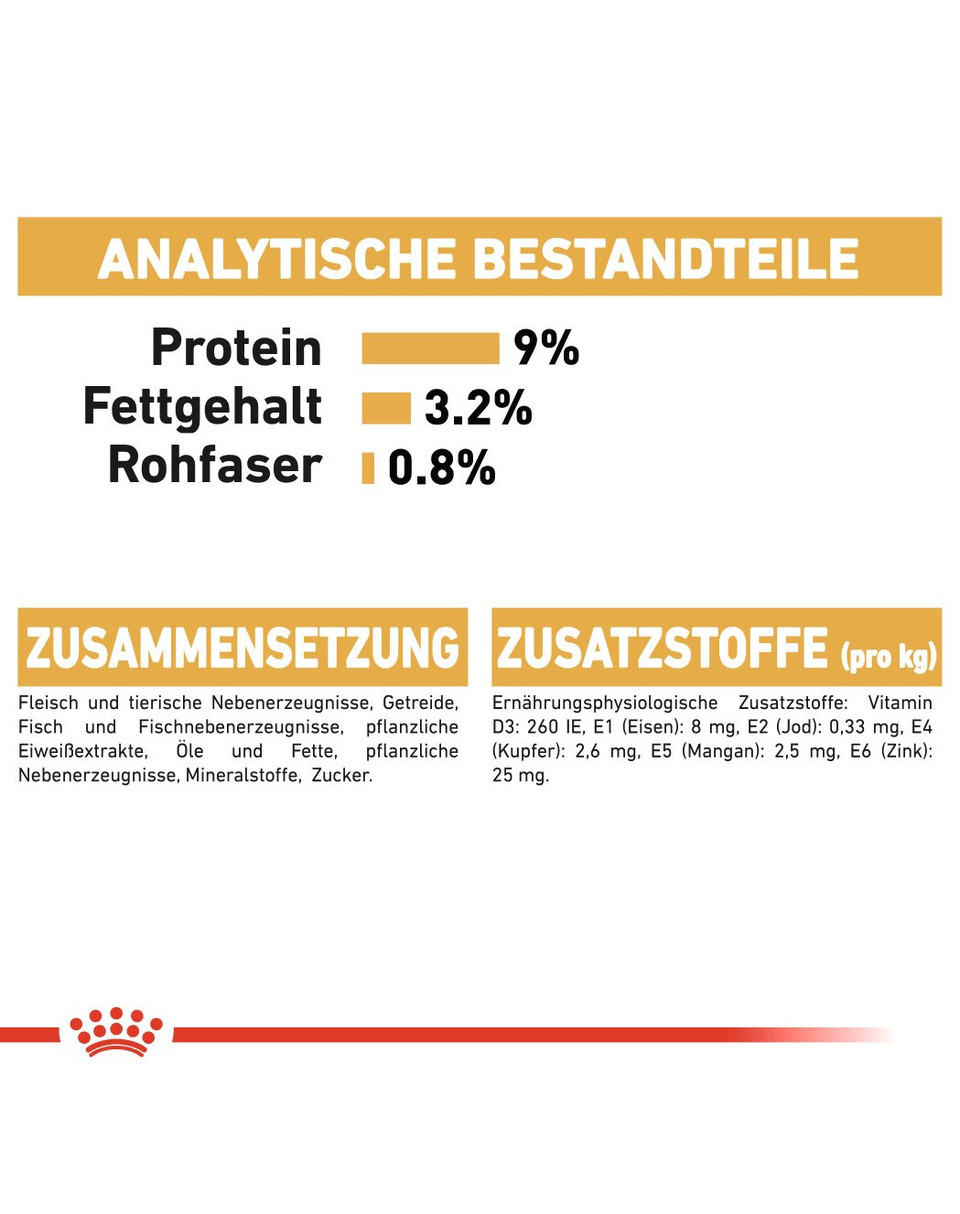 ROYAL CANIN British Shorthair Adult in Gravy innehåller ett måttligt energiinnehåll och en justerad fetthalt (3,2 %) för effektiv viktkontroll av BKH - vilket minskar sannolikheten för oönskad viktökning.För att bibehålla hälsan hos brittisk korthårs korta, tjocka och fluffiga päls innehåller ROYAL CANIN British Shorthair Adult in Gravy utvalda näringsämnen och en mängd olika vitaminer. De ger inte bara en frisk och vacker päls, utan främjar även hudens hälsa.