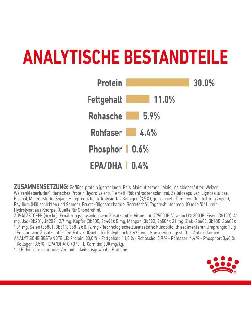 Protein: 30,0 % - Fetthalt: 11,0 % - Råaska: 5,9 % - Råfiber: 4,4 % - Fosfor: 0,60 % - EPA/DHA: 0,40 % - L-karnitin: 200 mg/kg.