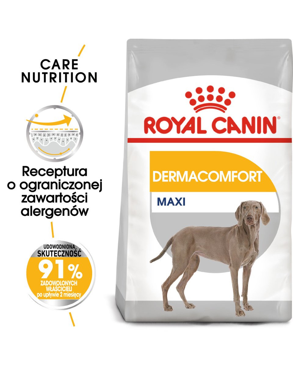 ROYAL CANIN Dermacomfort Maxi är formulerat med aktiva näringsämnen som bidrar till hälsan hos din hunds hud. Det innehåller omega 3- och 6-fettsyror som lugnar huden. Detta gör huden mindre känslig för irriterande ämnen som din hund kan komma i kontakt med.