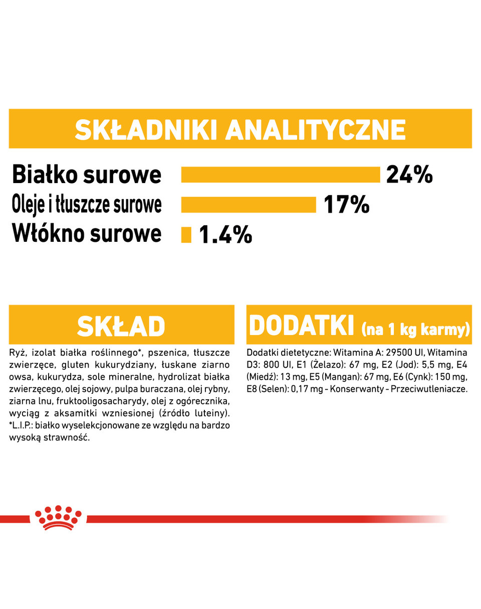 Mat är berikad med omega-3-fettsyror, som har antiinflammatoriska egenskaper. Fettsyror från fiskolja och vegetabiliska oljor hjälper till att lindra irritation och skydda din hunds hud genom att minska dess känslighet för skadliga miljöfaktorer. Dessa ingredienser främjar också pälsens hälsa och skönhet. ROYAL CANIN Medium Dermacomfort är ett mycket välsmakande foder med noggrant utvalda proteiner som sällan är allergiframkallande. ROYAL CANIN tar urvalet av råvaror, särskilt proteiner, på stort allvar. Endast proteiner av högsta kvalitet används, anpassade till den enskilda hundens specifika behov.