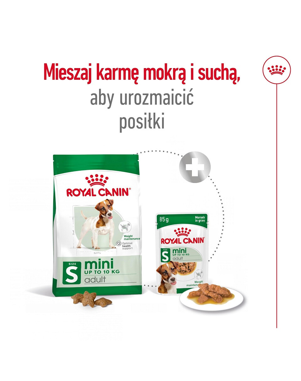 Torrfodret ROYAL CANIN Mini Adult kan användas tillsammans med lämpliga våtfoder från Royal Canin, i form av paté eller bitar i sås (blandad utfodring). Att ge både våtfoder och torrfoder varierar måltiderna och ökar hundens intresse för maten. Torrfodret ger en mekanisk rengöringseffekt, vilket hjälper till att upprätthålla tandhälsan, och den höga vattenhalten i våtfodret främjar hydrering och hälsan hos den vuxna hundens urinvägar.